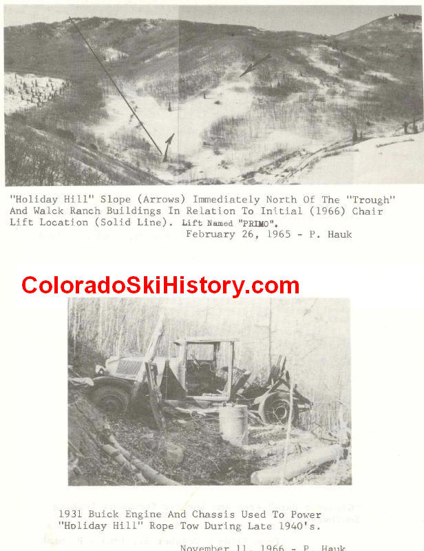 | Operation Dates: 1946 - 1949 Lifts: 1 tow History: The area operated at the base of the current Sunlight Ski Area. It opened back in 1946 with the second longest ski tow in the state. It was powered by a Buick engine and had a line speed of eight miles per hour. Based on an interview with the former operator, Don Vanderhoof, when the downshifted engine gears, it would send people flying off of the tow! Holiday Hill operated only on weekends and Wednesdays only. The largest recorded attendance at the area was about four-hundred and fifty people. While there were plans to expand the hill by installing a T-bar, the town discouraged the idea because construction of the nearby Red Mountain Ski Area began. This resort included one of the state's first single chairs. Holiday Hill later closed in 1949 and construction of Sunlight Ski Area did not begin until 1965, when a permit was issued for the construction of the resort. Directions: Located at the base of the current Sunlight Ski Area |