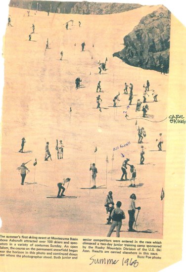 | "In the '60s I lived and worked in Aspen as a graphic designer and photographer. I designed graphics, brochures etc for Max Marolt to promote a Summer race camp at Montezuma Basin. Some of the coaches were Andrl Molterer, Ernst Hinterseer and Max was the director. We had great fun skiing there in the summer months." -Unknown "I have very fond memories of skiing Montezuma Basin as a teenager. In the summer of 1972 I attended two back to back summer ski racing camps run by Rick Rosen. I skied a total of 40 days in a row! The camp was attended by mostly teen racers from around the country, however Rick had invited VIP guests visit to ski on the snowfield, the most famous of which was the Olympic Bronze Downhill Medalist, Billy Kid, and the aspiring racer Andy Mill. We skied gates every day, mostly slalom, sometimes GS. The snow conditions were fantastic throughout July. At the top of Montezuma, one could climb and see Castle Lake, frozen even in July, and occupied by a lone Beaver. A typical day was a wake-up call at 5am, and then we would bundle up in the back of Rick's pick-up truck, which was a converted open seating area, with built in benches on either side. We would brave the sub freezing early morning air to climb to 13,000 ft. We would run slalom gates all morning. There was a make shift primitive t-bar with big fly wheels and we would set courses all morning until the snow got too soft. Often we would run down the mountain on the road or thru streams to build agility. Rick actually joined us on one of the runs, and in dramatic fashion, he broke his leg on a big boulder. Days later, in a cast, Rick skied down the slalom course, on a day where he was so upset with our racing technique, that he showed us how to do it, with one foot in a boot, the other free in the wind! It was quite the site. I also remember hiking up in the Basin near the old silver mine, where we would find Chinese shoes and old perfectly built walled paths, that hugged the mountain side. Rick was a fantastic coach, and even today 30 plus years later, I remember a coaching session that still resonates for me today, "You conquer the mountain, don't let it conquer you." It has been a guiding principle for any obstacle I've faced in life. So these are just a few of my memories of skiing in Montezuma Basin as a 13 year old boy. What a joy to recount some of these memories." -Scott R. "In summer of 1968 a group of VT Jr Ski racers including Carol Skinger (me) and Wendy Woodworth and VT Sr Ski Bill Farrell and others drove from VT to Aspen to train on summer snow. We rented the Talbot A frame- think that is what it was called – on road up to Montezuma Basin . We brought our own Mighty Might cable tow lift and a generator. We set it up on snow above the hut and skied gates in the early part of the day. Greg McLelland and Crandy Grant Rutland, VT were coaches. About the Montezuma Basin Race-1st Annual summer slalom: The race and area in general was short lived and I am not sure how many races they continued with. I won the women’s race. I was listed in the article as “Carol Skaeringer Senior A”. In fact I was Carol Skinger Jr B at the time. Bernard Mayer won men’s race, I think at one point I spoke to Dave Durrance, 7 or 8 years ago and he said he won the race at one point possibly the following year. Me and Bill Farrell were the only ones from our training camp interested in getting to the race and going in it, possibly because it involved getting up when it was still dark, hiking with your skis to the area, then climbing the course- no lift. None of us had 4 wheel drive so Bill and I decided to get up early and walk the few more miles up to Montezuma Basin . We ended up getting a ride from someone in a jeep." -Carol S. |