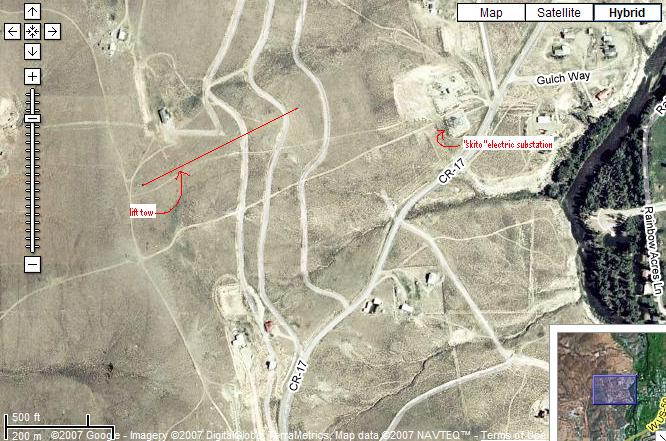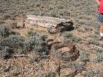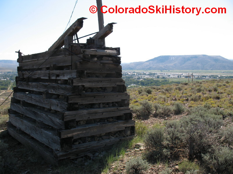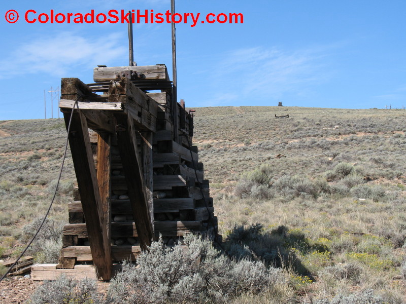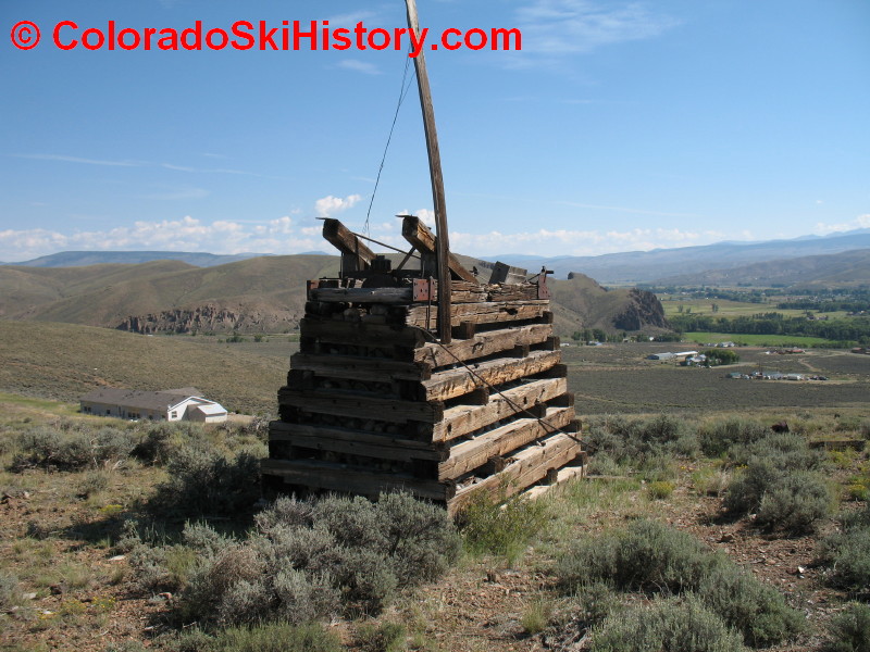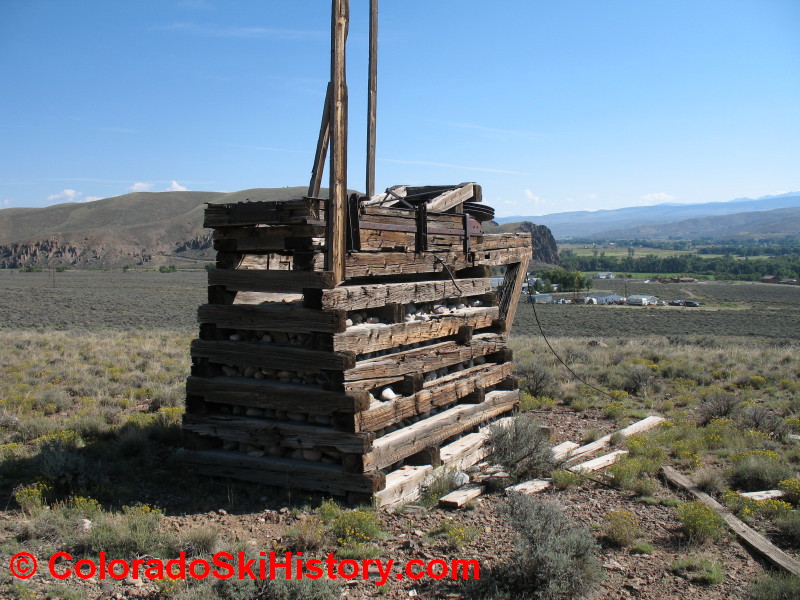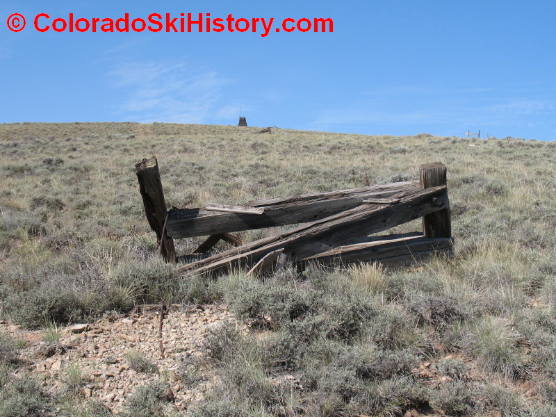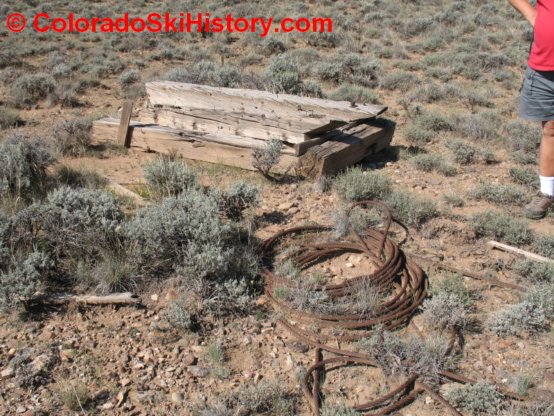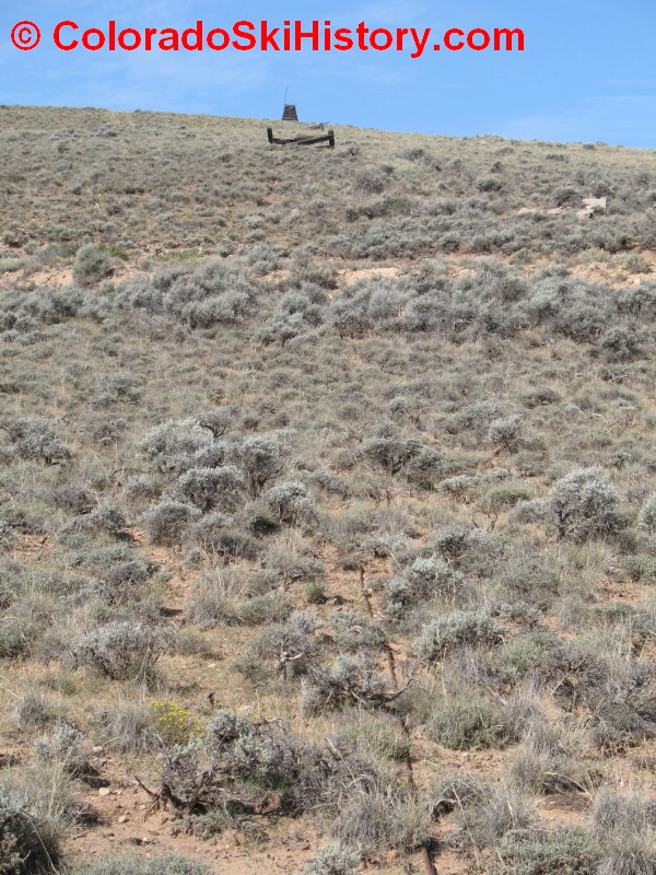 | "In 1993 we recorded the site of what is referred to as the Gun Club or Practice Ski Course near Gunnison. It was the forerunner of the Pioneer Ski Area. It was constructed in the winter of 1936-7 or early 1939 by WPA and volunteer workers using WPA funds. The Gunnsion County Ski Club was formed to secure the funding. The rope tow was operated by a 6-cylinder Buick engine. The cable and wooden support structures are still in place on the ground and there is an area that appears to have served as a snack bar. It seems to have operated unto at least the late 1940s and maybe into the early 1950s." - Jon H. [Editor Note: Sagebrush Hill only operated until 1938] |