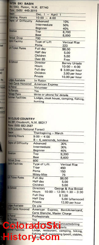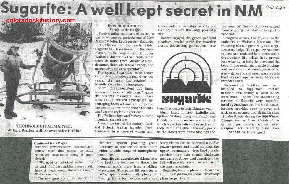 | Have you ever skied Sugarite? If so, contact us! Memories: "I skied at Sugarite during the 1983-84 season. In fact, that is where I learned to ski. (I later became a ski bum, married a ski bum who is now Lift Ops Manager for Mountain High Resort.) My whole family (Mom, Dad, & Sister) learned to ski at Sugarite. There was just a poma lift and a double that I remember. The double was only open 1 day during our 4 day vacation. I remember my sister and I went up the double and came down most of the way on our butts. I also remember my sister and I met 2 college guys from Amarillo (I was a Univ Sophomore, my sister was a HS Sophomore) and skied with them. It was a one-day "fling" I'll always remember. We stayed in a motel in Raton, NM. Sugarite was where I fell in love with skiing - a love which has continued for 20 years." -Zina T ---- I lived in the cabin right next to the Sugarite ski lodge for 4 years. I attended the top lift during the ski days and played guitar in the lodge at night. The best 4 years of my life. When the lodge sold and i had to move out it was the saddest moment of my life. I now live in Philadelphia and run a computer consulting firm... What a contrast. Its nice to see this page and know that it wasn't just a dream. -Tommy C. ---- "Sugarite was my family's ski area. I grew up skiing and loved every minute of it. The memories of Sugarite are priceless. It was a terrible day when we had to sell the area. Even worse was the day we lost my grandfather Milard Walton whose everything was Sugarite. I look up on the mountain now and I can still see him.....he is there, he has been there, the cowboy, my grandfather, Milard Walton." -Tausha ---- "Where did time go? I was unaware that Sugarite was no longer around. I, like the some of the previous posters, learned to ski there in the early 80s. It was a great place to learn. It's a shame they had to tear it down. When we went to the horse races in Raton, we once went go up to the Lodge for supper. The landscape is still as beautiful as ever. With this site - you are keeping great memories alive." -John "Not only did I learn to ski at Sugarite, I was married in the lodge. A year or two previously I also worked for Milard and LaBelle one season as a cook. I'll always remember Milard's broiler he had in the kitchen there. It cooked both sides of the steak at the same time. An amazing grill and an amazing place. I am sorry to hear of Lynette Walton Wesselhoeft's passing in December of this year. Ski Sugarite really was amazing. There was a magic there." -Alan G.  |